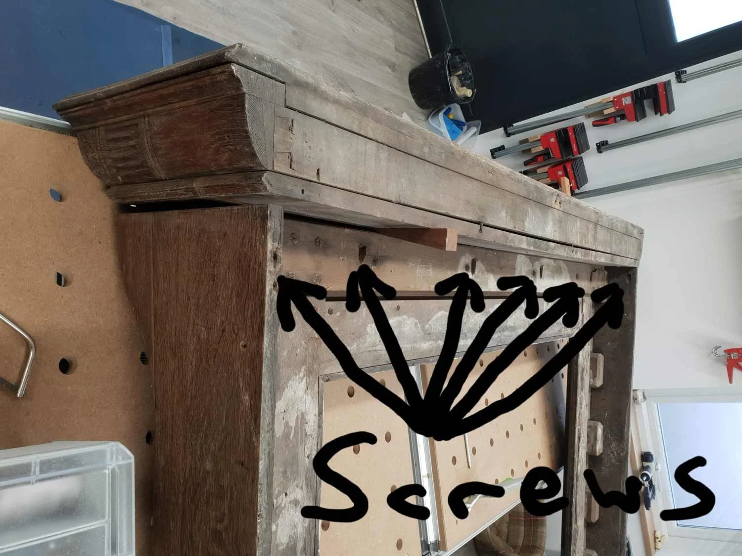 On putting it up on the bench the top parted from the surround slightly and i could see a wooden dowel pin between them and there were steel screws in the back which gave me the thought that i should try and part these two pieces to make it easier for me to manage and which in turn would make it easier to deal with each component as an individual piece – however i did question myself if this was a wise thought, but i made a decision to do it anyway – i must be brave !
